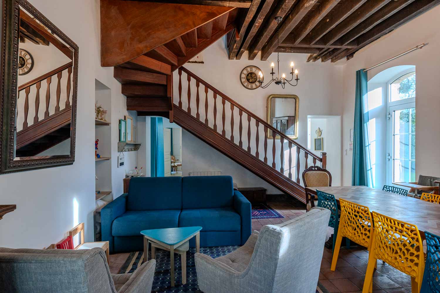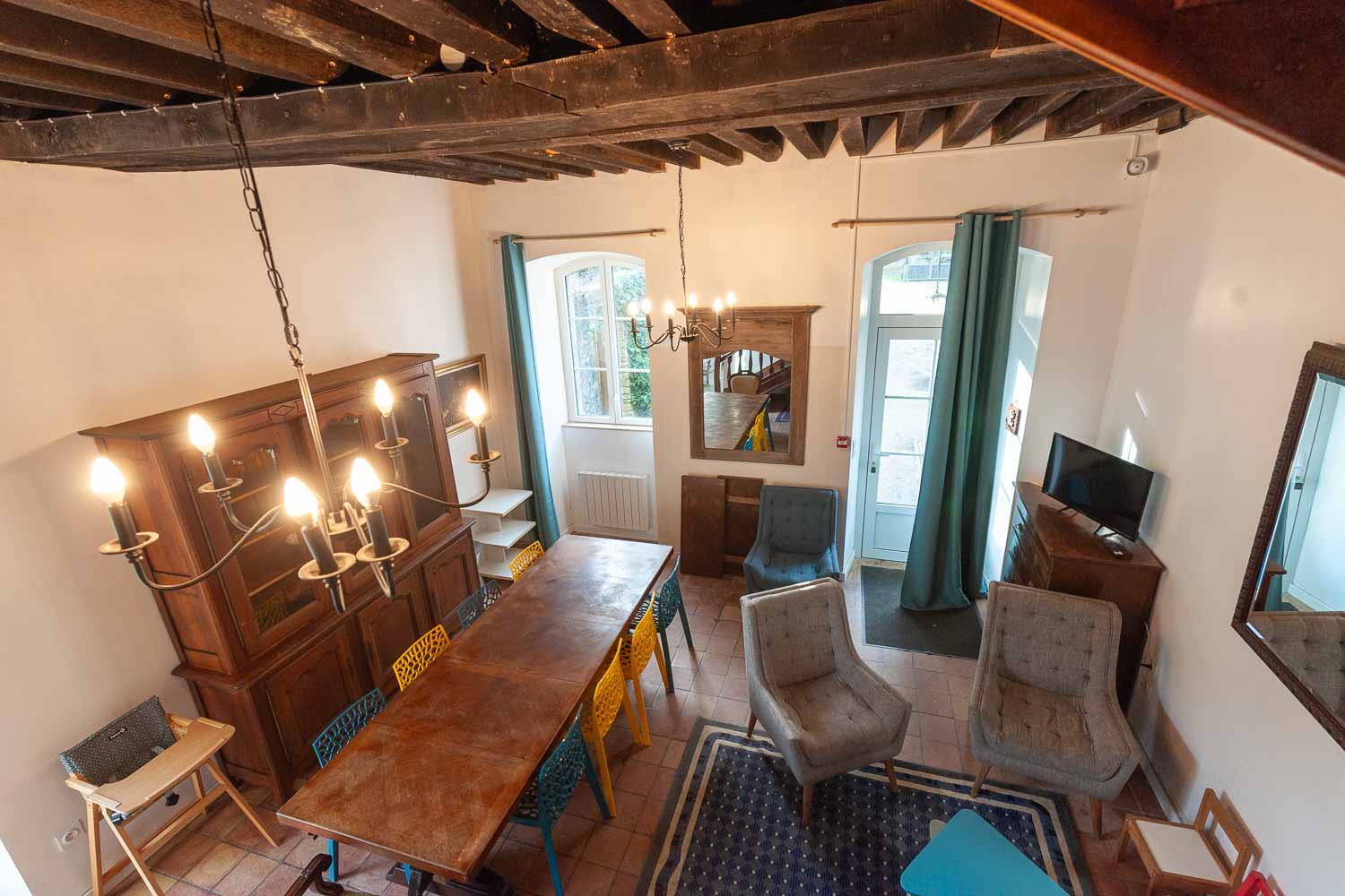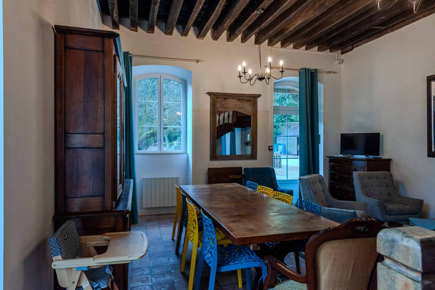 Gîte comprenant une grande pièce de vie, grande table, une cuisine équipée.