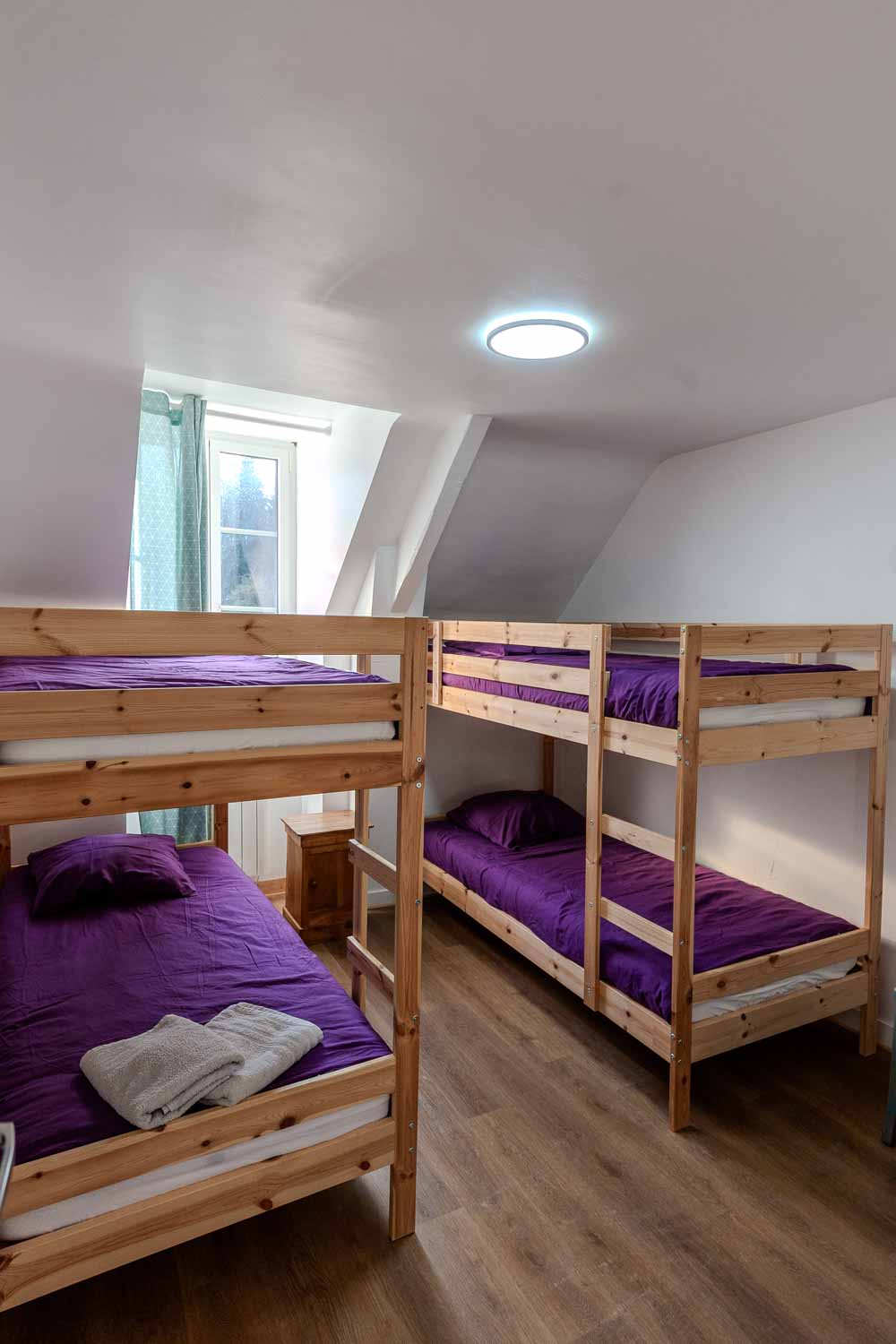 2 chambres (avec lit de 140x200cm), 2 dortoirs (avec 4 lits individuels), 1 canapé-lit dans le salon, salles d’eau, Wc indépendants